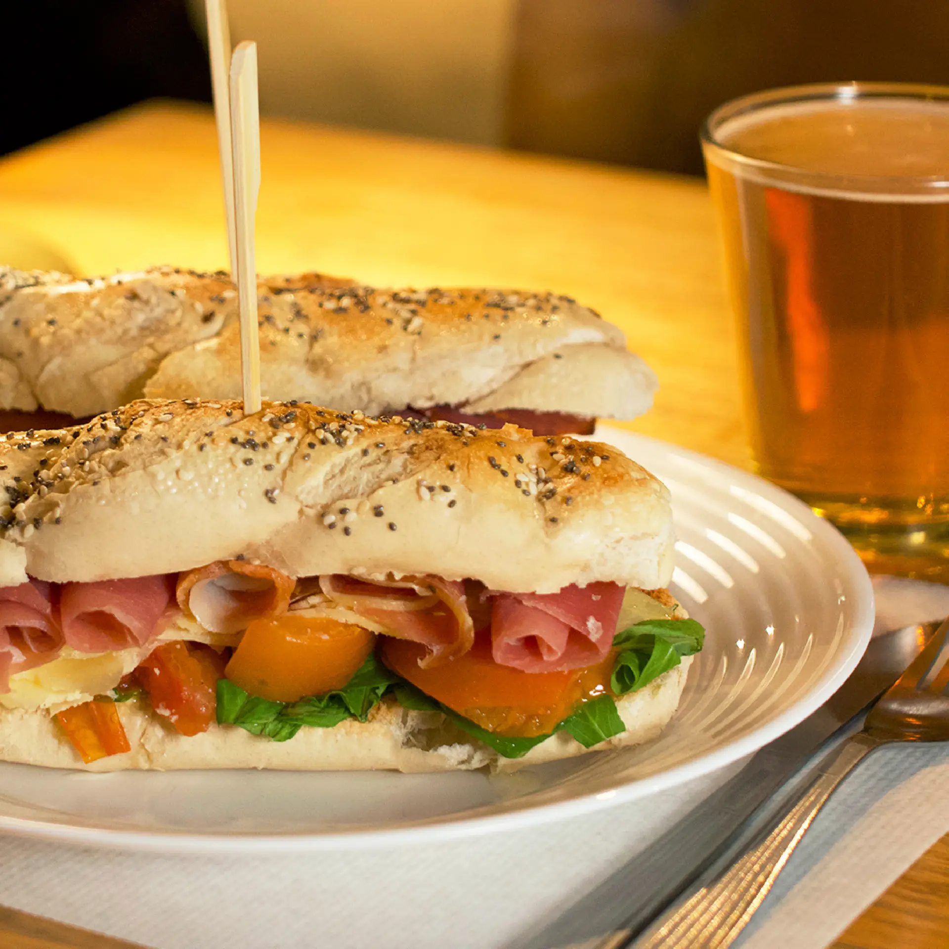 Sandwichs en pan brioche, rellenos de queso crema/ciboulette/tybo, Opcionales: jamón, patrón, tomates. Tamaños Small o Medium.